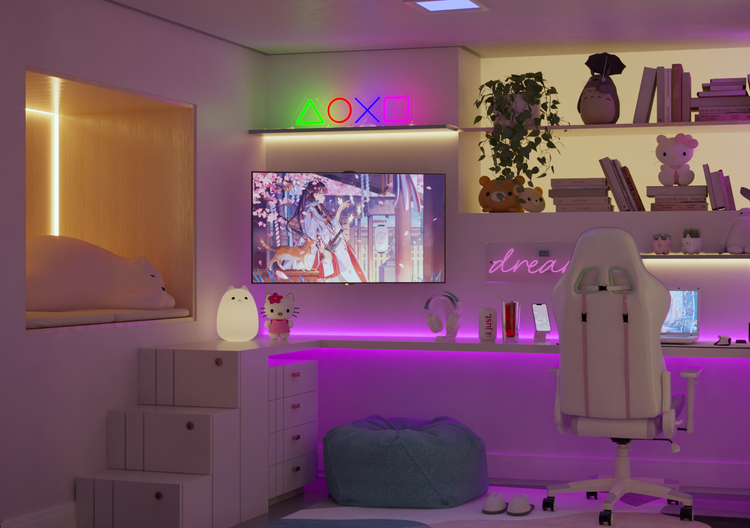 Além disso, consideramos a organização e a disposição dos elementos no espaço, criando áreas distintas para jogar, assistir a vídeos, socializar com amigos e armazenar equipamentos.